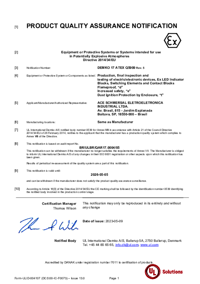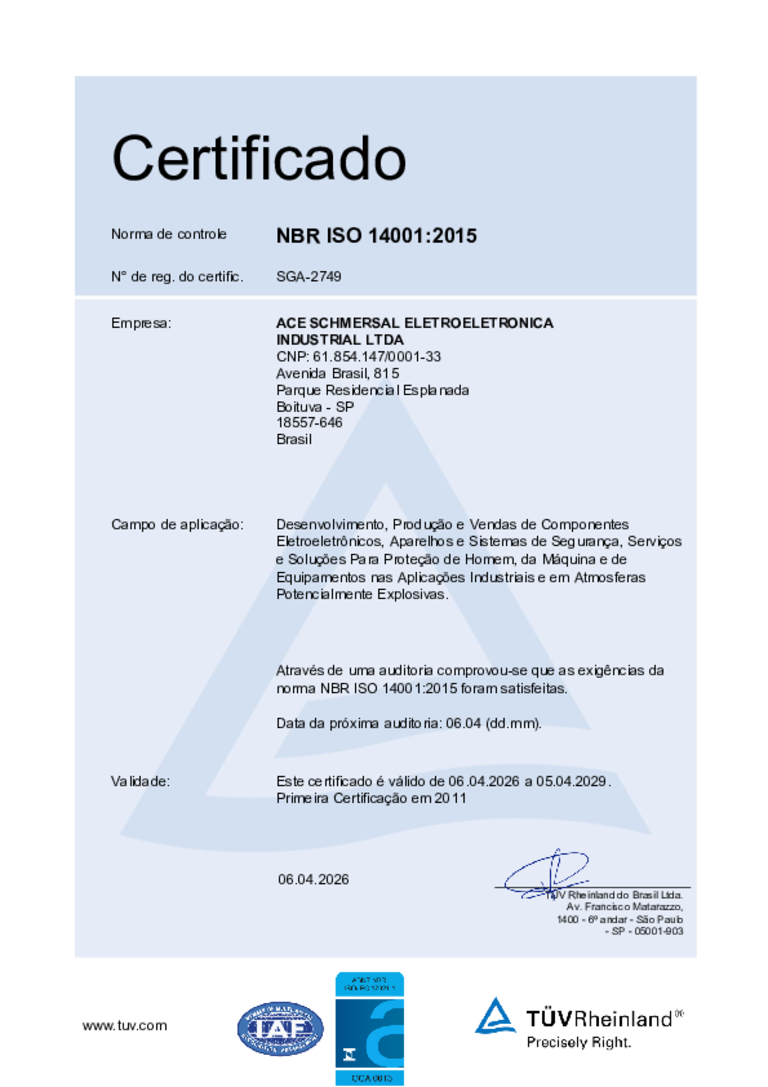 Todos os locais do Grupo Schmersal que desenvolvem e produzem dispositivos de segurança para aplicações à prova de explosão também possuem certificação de acordo com a norma DIN EN ISO 9001, que estipula certificação e aprovações para o sistema de gestão da qualidade com base nas diretrizes e padrões aplicáveis. Este é outro recurso dos altos padrões de qualidade do Grupo Schmersal. Isso garante a segurança necessária na área muito sensível de equipamentos (de segurança) de chaveamento para ambientes com risco de explosão.